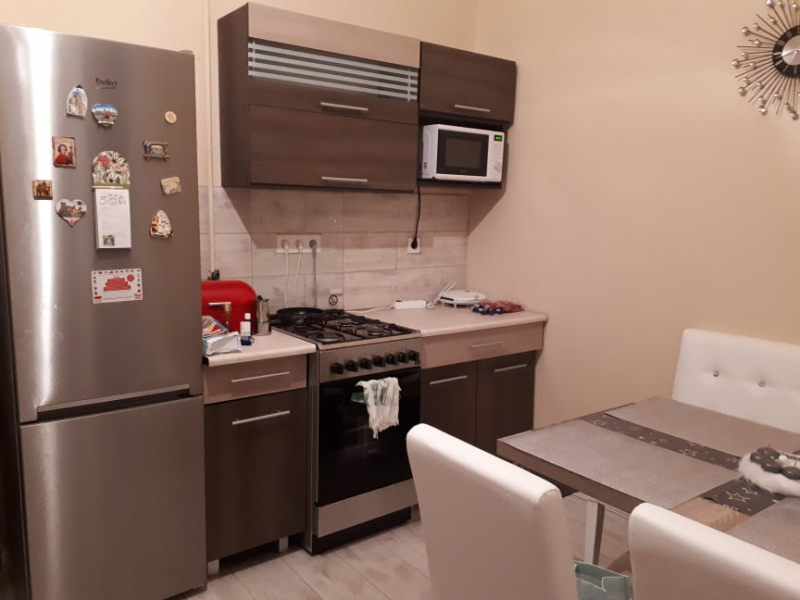 A lakás 77 m2, rendkívül tágas, előszoba, konyha és étkező, fürdőszoba, hálószoba, nappali, erkély. Harmadik szoba kialakítása lehetséges a nagyszoba leválasztásával. A konyha felszereltsége: beépített konyhabútor, gáztűzhely és elektromos sütő. A fürdőszoba felszereltsége: sarokkád, WC, mosdókagyló beépített tükrös szekrénnyel. Fűtése gázkonvektor.
